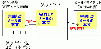 @案内メール画面で「クリップボードにコピーする」ボタンを押すと、メール本文がクリップボードにコピーされます。